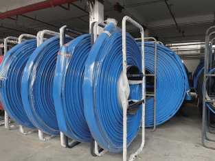 礦用高壓排水軟管采用一次性共擠成型工藝,由TPU內(nèi)襯、編織層和TPU覆蓋層組成。TPU覆蓋層阻燃、抗靜電;編織層內(nèi)含有抗靜電導(dǎo)線,TPU內(nèi)襯可通過(guò)水、泡沫液、含油或弱酸堿性等液態(tài)介質(zhì)。這種結(jié)構(gòu)使得軟管重量輕、承壓高、質(zhì)地柔軟、可卷盤(pán)、操作方便、鋪設(shè)及撤收機(jī)動(dòng)靈活。